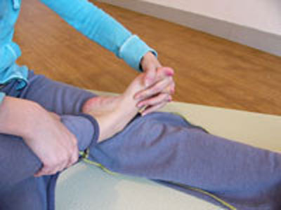 弯曲双腿,将右脚的脚跟放在左脚的脚掌位置,然后用右脚跟对整个左脚脚掌进行来回的揉捏。