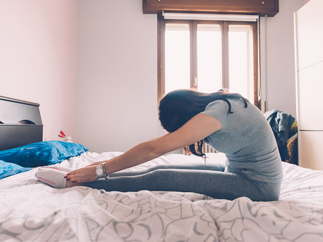 后背平直躺在床上,头部以及背部要伸出床面,顺着床沿将头部以及背部向下躺。保持身体背面向后拉伸的姿势三到五分钟。